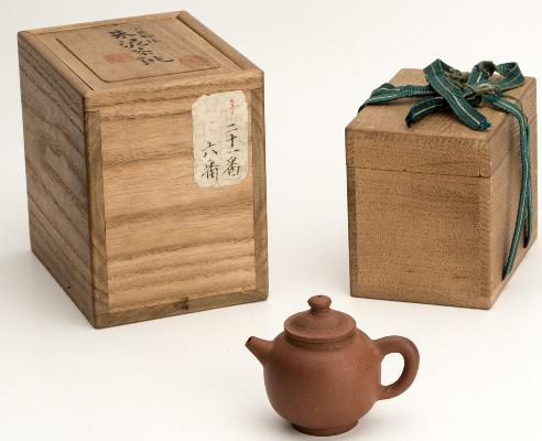 此藏品為寶珠形銀壺,造型獨特,是形器仿照日本國旗「日之丸」而製,有艷陽東昇,萬物欣欣向榮之意。壺身、壺蓋及鈕摘均以環輪線飾,配三彎壺流,半圓提梁上包裹皮革,為此壺添上一抹精細與粗獷的和諧之美,於銀壺屬少有之作;底款「純銀」。