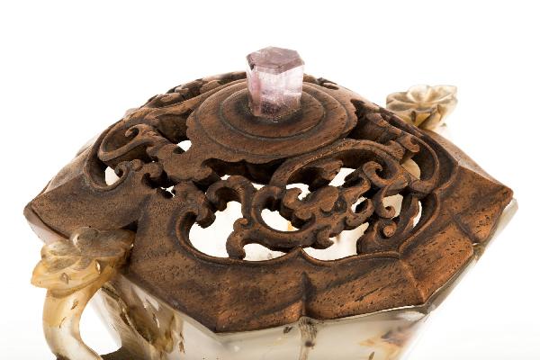 由於瑪瑙兼具瑰麗、堅硬、稀有三大特徵,自古以來被視為美麗、幸福、吉祥及富貴之代表。此杯為六瓣形制,仿如妖嬈瑰麗之花朵;左右伴花枝形雙耳。該杯身之瑪瑙之天然色澤濃鬱,具玉質感;木雕如意雲頭頂蓋及底座配紫晶鈕摘,令整器更顯華麗高貴。