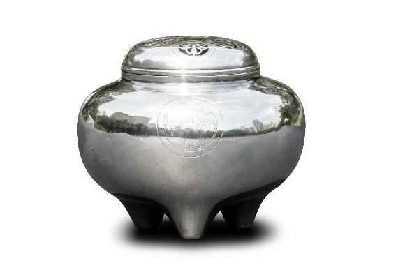 此香爐寶珠形製,圓潤飽滿,鼓腹束頸;整器皆為純銀所製,純銀幽光古樸靜謐。爐腹上雕日本名將大友家族之花杏葉紋,爐蓋亦雕有縷空花杏葉紋七組,可見為皇室貴族及富貴人家所專用。下承三乳足,圓潤討喜,醇厚沉穩。