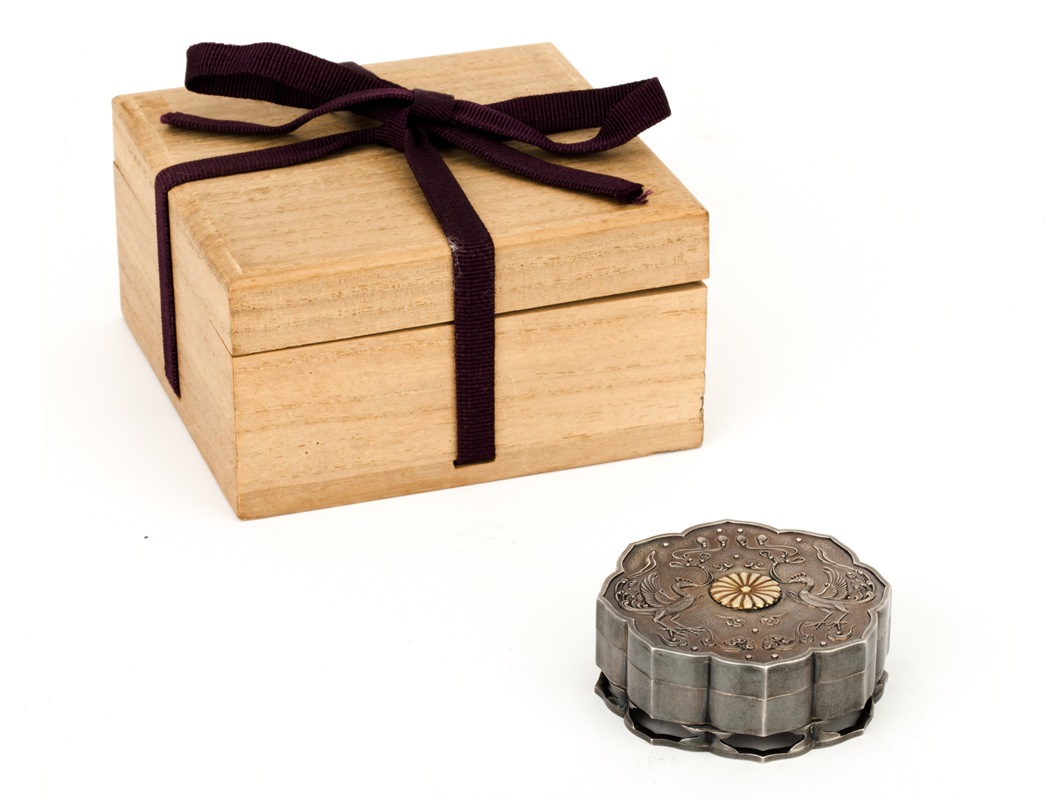 香盒為明治時代日本皇室御用銀匠宮本所造,底款「宮本謹製」;共箱。