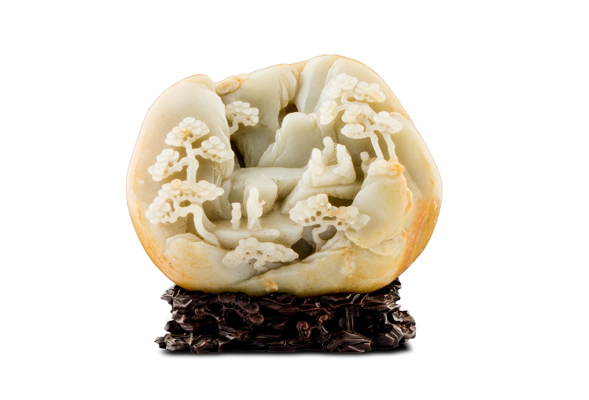 此藏品邊緣及背部遍撒黃皮,皮色奪目。正面剔皮琢肉雕現重巒疊峰,松柏佇立於山間。下方仙翁盤山而上,赴友眾首,童子緊隨其後。上方兩君對弈,一人靜觀,另一頑童探頭偷看,生動非常。整體莊重大氣,油度極佳,刀功利落,蘊含超脫世外的生活樂趣。求王守仁言「世外煙霞亦許時,不及山中一著棋」之意境。