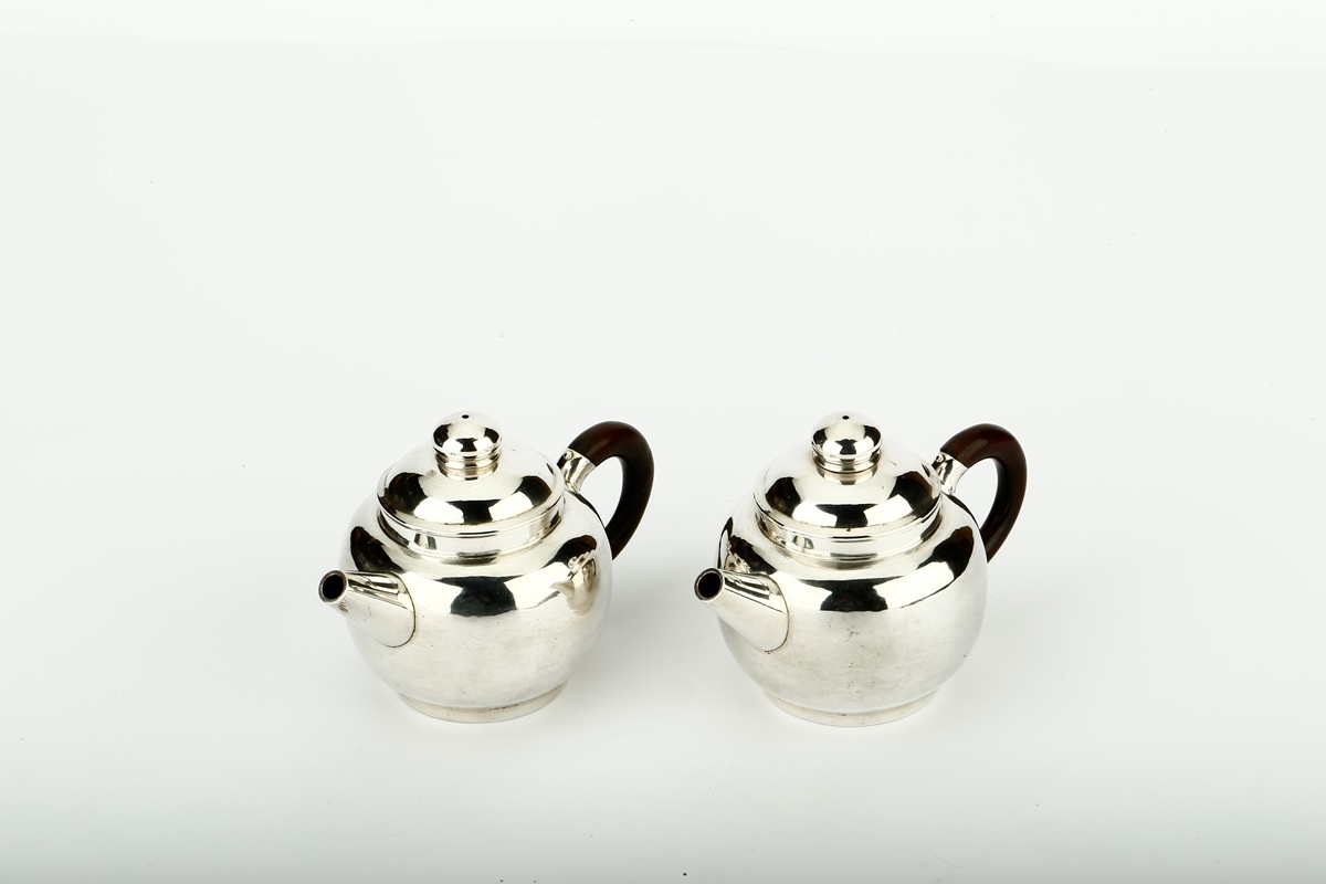 精巧雅致的純銀壼一對,鼓腹砲式直流,頂配圍棋子式摘鈕,形似紫砂茶壺,配黑檀木把,共箱。銀器無味,殺菌,優化水質,用其沖茶,能令茶湯滋味更甘醇甜美。