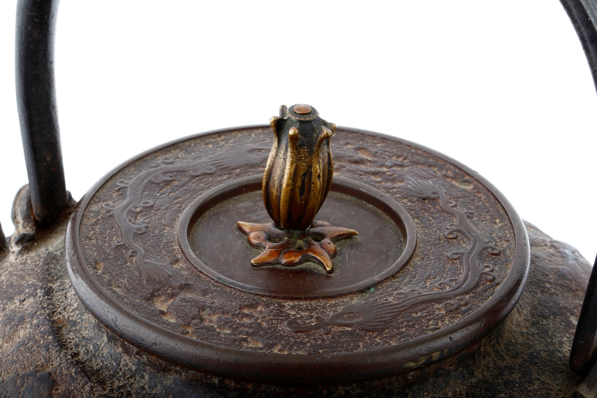 壺蓋配有一圈龍紋,飛龍騰雲駕霧,氣勢威武。蓋頂上飾高身花苞摘,亭亭玉立,拉伸器形整體比例外,亦在古拙氛圍中平添芳雅之生機,意趣盎然, 整器懷素古典,芳華清雅,為個中精品。