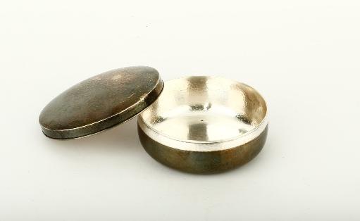 此藏品為生鐵鍛造,共箱。器形極典雅樸拙,圓扁拱形提梁嵌銀如意回紋,壺身以鎏金飾出一幅山水圖,一邊嵌有一輪銀月,伐舟之人徐徐過江,悠閒自得;另一邊可見一漁人獨立於橋上垂釣,意境生趣天然。