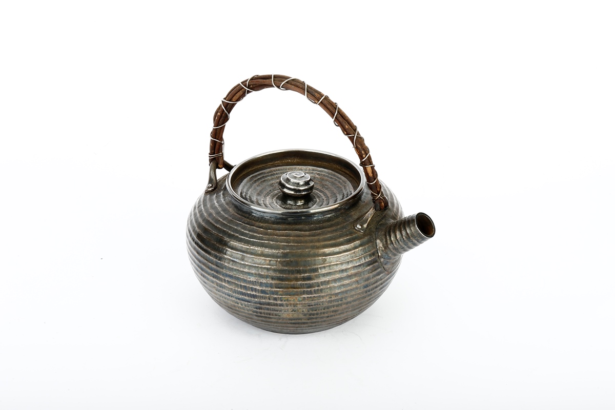 此拍品為一鶴齋造純銀鐵壺。一鶴齋是創立自江戶時代的日本銀器老堂號,專門為貴族打造器物,以其工精湛,精益求精而馳名。整器以筋目玄紋打造, 層次分明,亦作同紋摘鈕呼應,塑造出素雅古拙,醇厚質樸之韻。共箱,箱蓋款「一鶴齋造」。