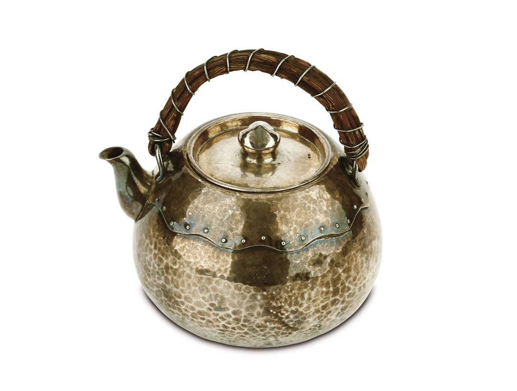 此藏品純銀手工鍛造,壺身潤如圓月,配槌目紋並飾鼓釘環繞於壺肩,彷彿鼓皮覆蓋壺身,匠心獨運,意趣精妙; 藤編手把直立,銀蓋摘鈕圓潤別緻,呼應整器造型;配二彎式壺嘴,出水流利順暢,方便實用。