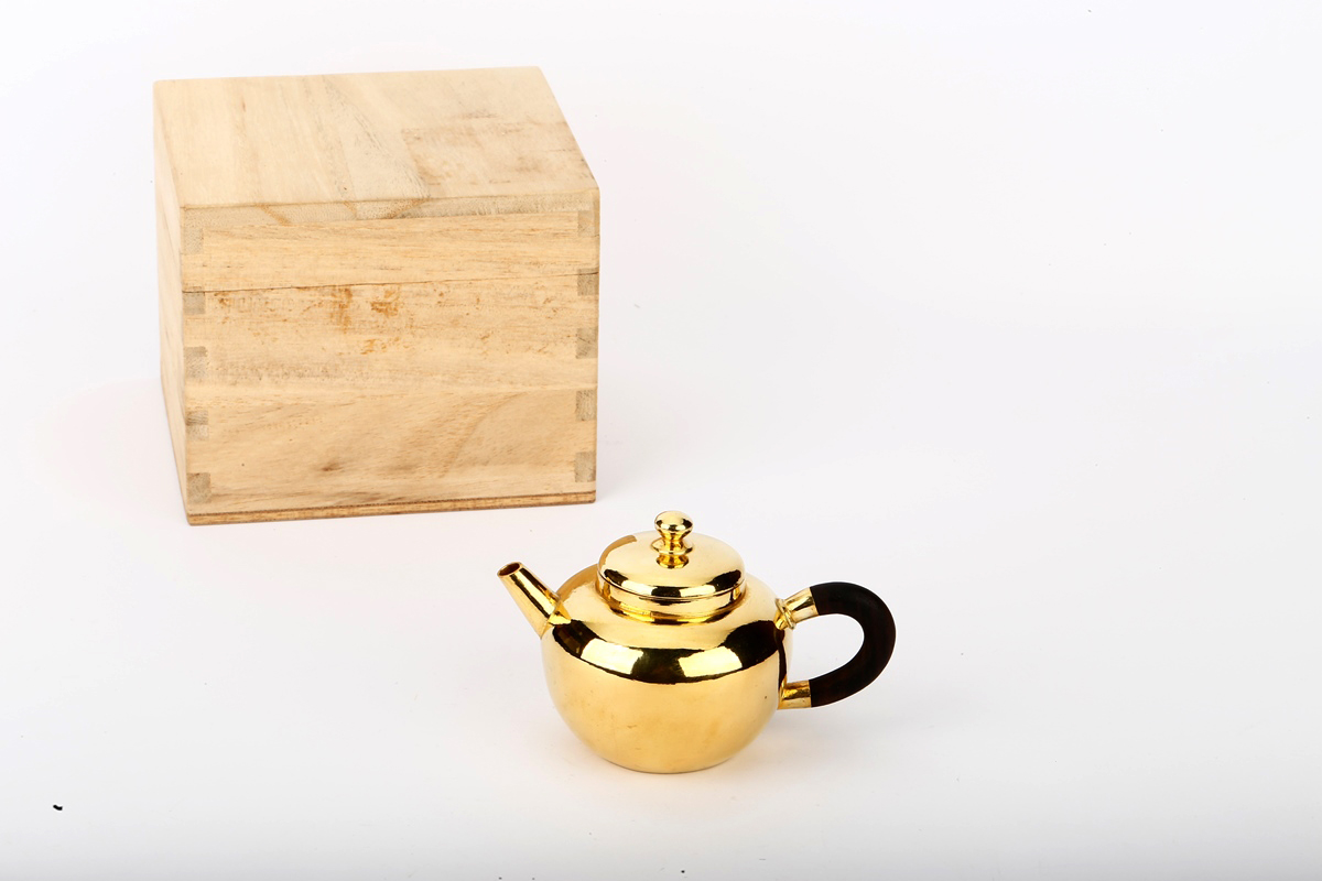 其形小巧方便,適合日常使用,直流,出水順暢明快,能優化茶湯品質;配檀木壺耳,增強實用耐用度外,亦為金壺添加了幾分雅致古拙,別有神韻。據《茶經》記載,金壺煮水能讓茶湯在喉韻與香氣之間取得絕佳的平衡,能用金壺沖茶,福份匪淺。