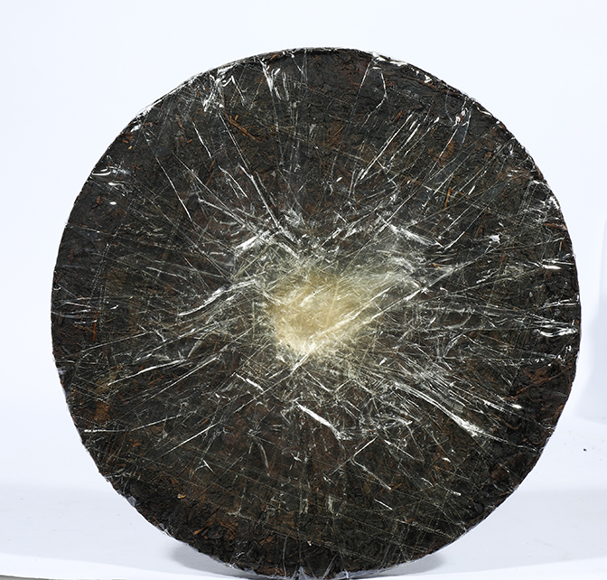 本藏品為五十年代的廣雲貢餅,倉儲條件較佳。內票沿用印級茶的「方形八中」設計,但票型較細小。是廣雲系列中最特別﹑目前所剩最少的產品之一。餅形比其他年代的茶餅大,但反面的凹洞卻是最小,且茶餅邊形呈角狀。