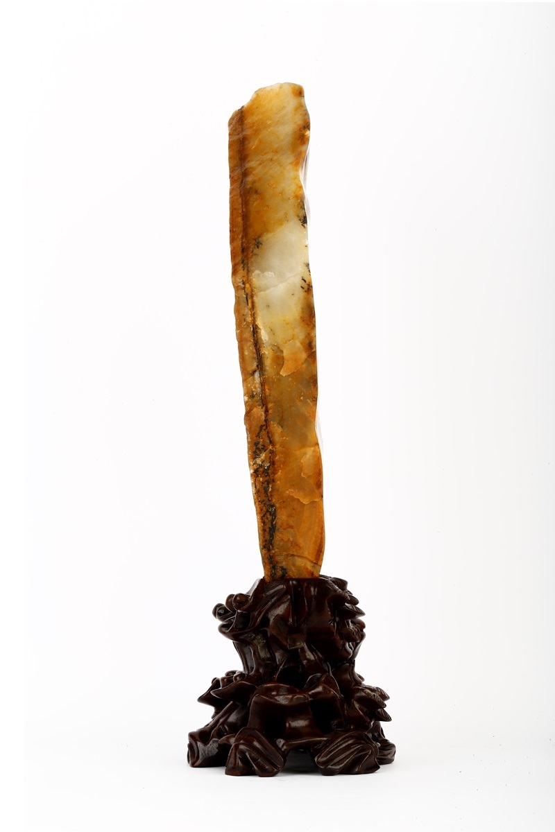 此藏品產於雲南龍陵縣,為廣東名石藏家珍藏;黃龍玉擁有翡翠的硬度,又獨具瑩黃和乳白若和田的色調,配上肉身中礦物歷經千萬年自然染浸而成的草花紋更是石中精品。