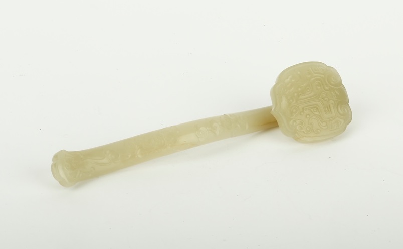 此藏品為白玉雕如意,手工精巧,玉質溫潤凝白,以雲葉作首,曲柄正反面皆浮雕祥雲紋,於底部雕飾展翅蝙蝠,寓意福從天降,福祿連連。共箱。