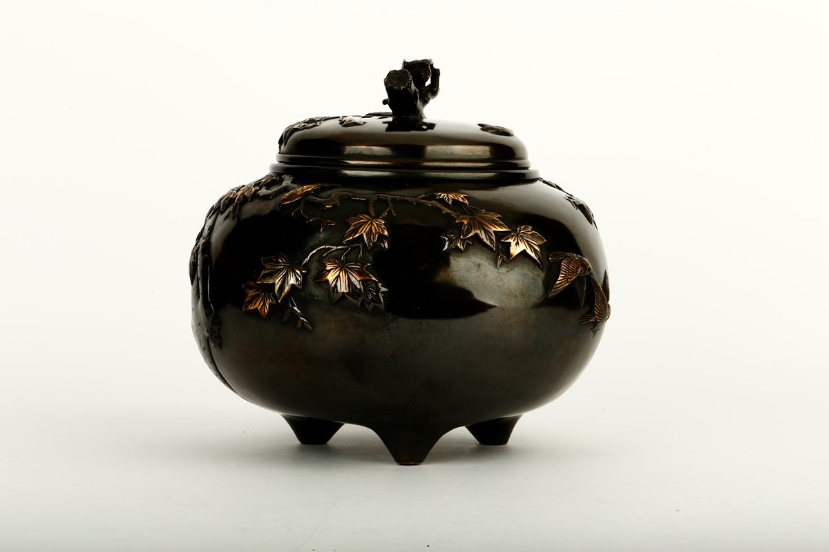 此藏品為圓腹仿古香爐,爐身淺浮雕楓葉花鳥並鎦金,明暗對比,層次分明;楓葉紋延伸至爐蓋,呈現妙曼而生機無限之美;爐蓋雕鳥摘,重現「楓染龍田川」的景象;器底「如雲」款。共證書及木箱,蓋有「龍田川文如雲」款。