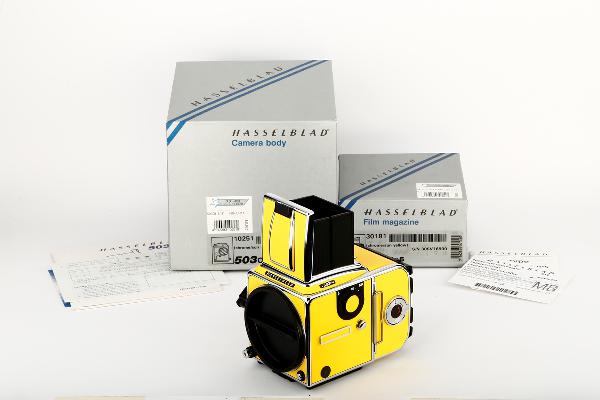 此為特別版帶星的503CW,機身覆以鮮黃色飾皮。配有A12後背 (#30SV16930)、機背蓋及相機帶。機身及後背均配有包裝盒、說明書及證書。
