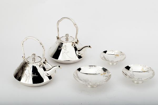 紹美造 日本純銀梅蘭竹菊松雕刻茶托五件
