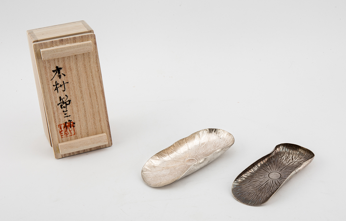 此對茶量分別出自兩位日本名師:北村靜香銀茶量,器底底部中央刻有北村花押「正」﹔木村節三銀茶量,底款「純銀」,共箱「木村節三作」款。這對南鐐蓮葉形茶量,手工精美,收藏或自用皆宜。