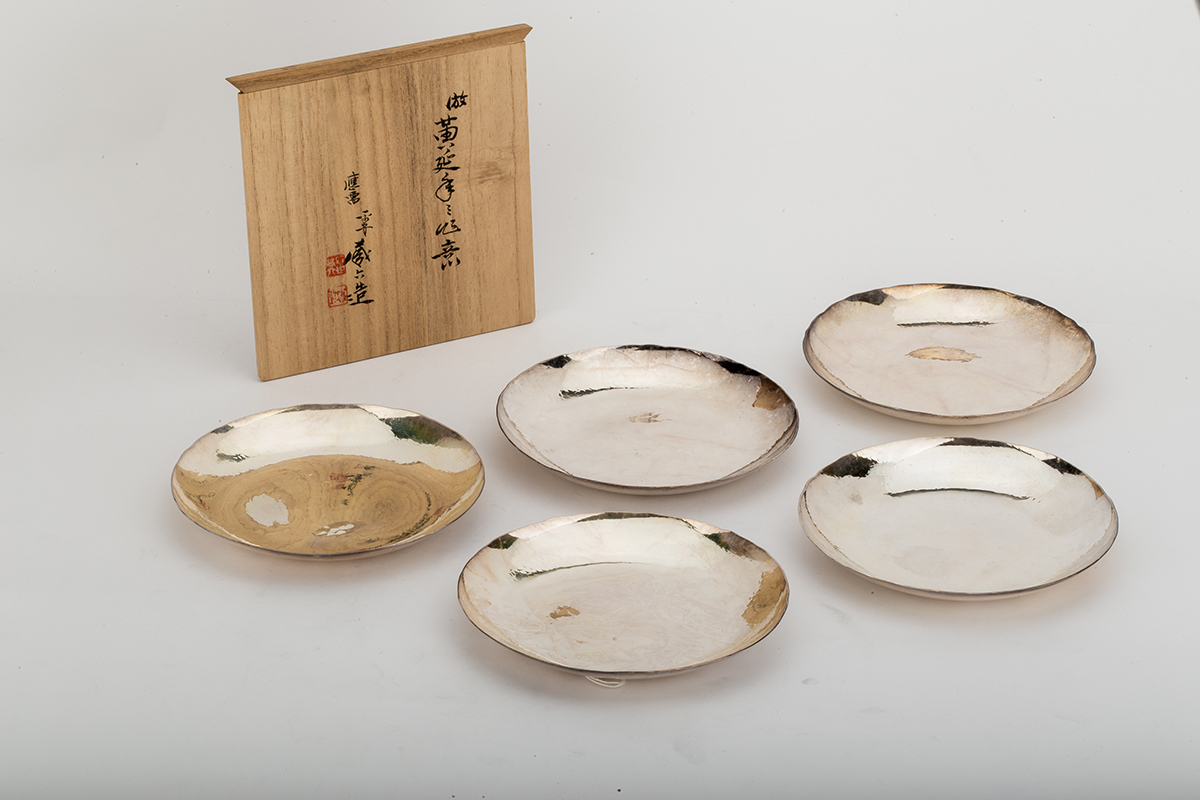 一套五件藏六造銀果碟,每件均見搥目紋及底款「藏六造」,共箱。已切開的水果若以純銀裝盛,則較不易變色。