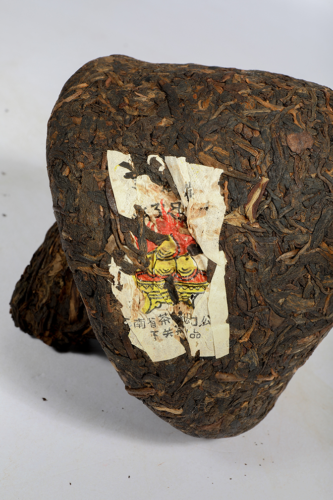 一批共十顆的寶焰牌緊茶,包括三條未曾開封的原廠紙袋包裝,品相極佳。其中單獨一顆見寶焰牌商標的內飛:內飛由紅黑黃三色組成,黃色香爐中的火焰象徵佛光,火焰燃燒正旺,代表佛光普照吉祥如意,四顆元寶則有貢茶的意思。下關沱茶名揚天下,如此品相倍添收藏價值。