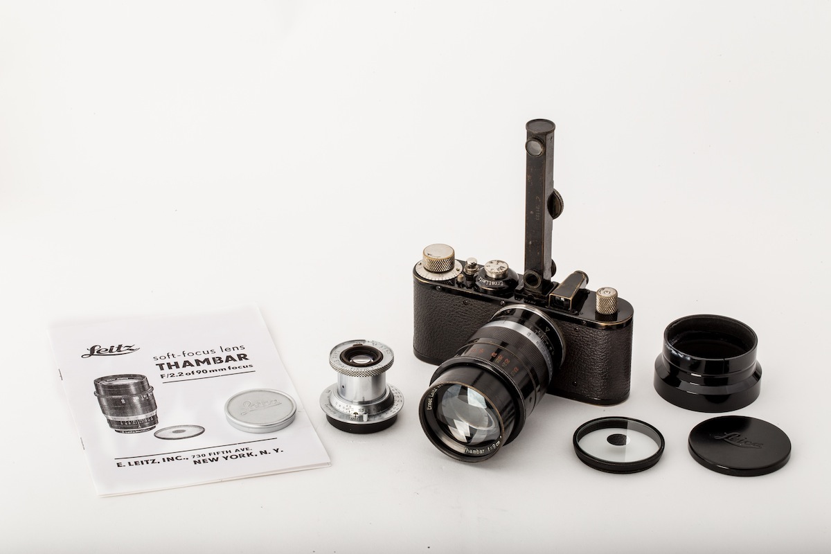 徠卡Standard黑漆機身配以兩支鏡頭,分別是Elmar 3.5/5cm (#730324)銀色鏡頭,配前後蓋; 另一支為徠卡著名的人像鏡皇Thambar 2.2/9cm (#311309) 黑漆鏡頭,它是徠卡唯一一款擁有柔焦效果的鏡頭,而且是早期產量較少的測距版本,帶測距杆 (#21123); 配有Leica柔焦濾鏡、說明書及遮光罩連蓋。