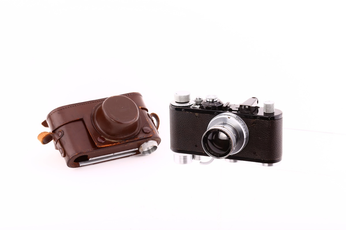 此黑漆Standard機身飾皮有修補痕跡;連同Summar 2/5cm銀色鏡頭 (#267007)、過片器及皮套,市面較少見。