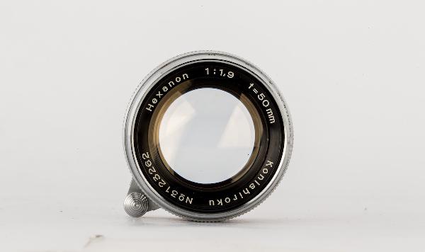 早期的柯尼卡Konishiroku Hexanon 1.9/50mm原裝M39卡口鏡頭,產量不多。連同鏡頭後蓋、遮光罩及遮光罩接環。