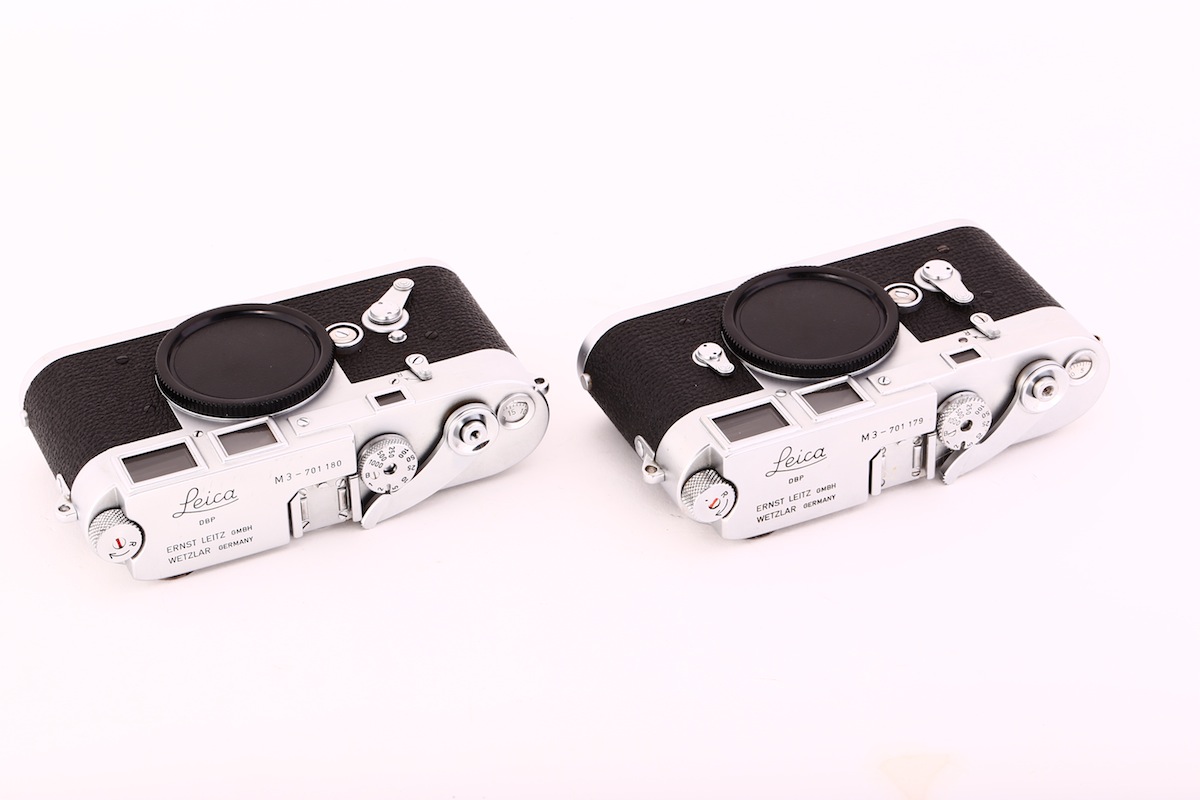 這是市場罕見的早期相連號M3對機。其中M3 (#701179) 的過片杆較短,屬兩次過片;而另一台M3 (#701180) 則是後期改裝版本,有較長的過片杆並屬於單次過片。此對相機均帶有機身蓋,操作正常。