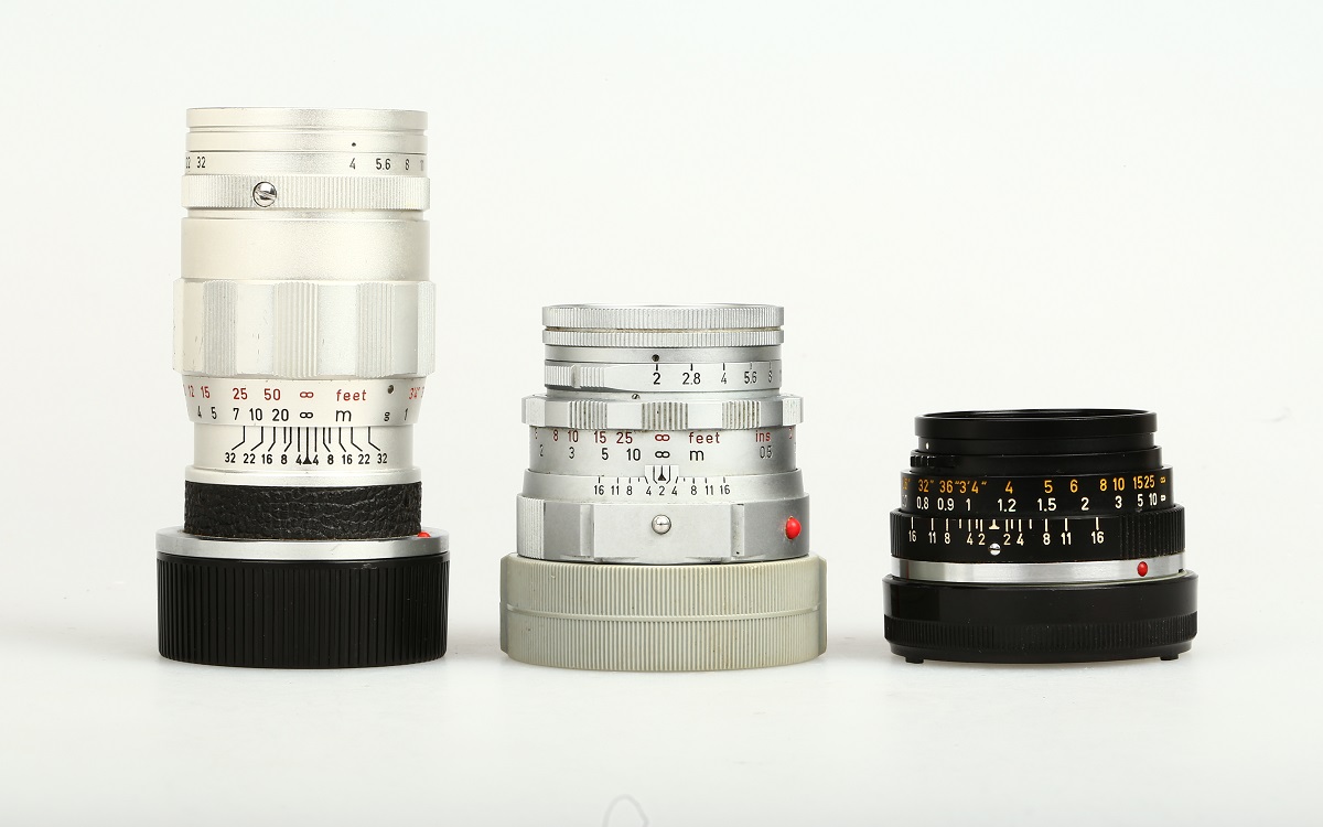 本拍品為產於1965年銀色的M2相機,配有三支鏡頭,包括:有六枚玉之稱的黑色Summicron-M 2/35mm(#2316436)配有鏡頭前後蓋;銀色眼鏡版Summicron-M 2/50mm (#2107781)配有濾鏡,眼鏡連皮套及鏡頭前後蓋;銀色Elmar-M 4/90 (#2089005) 配有鏡頭前後蓋。另備有兩條快門線、適用於以上三支鏡頭使用的遮光罩(#12504)、測光錶(#58214)、原裝包裝盒及皮套、相機蓋、鏡頭連接器及閃燈同步線。機背飾皮脫落。