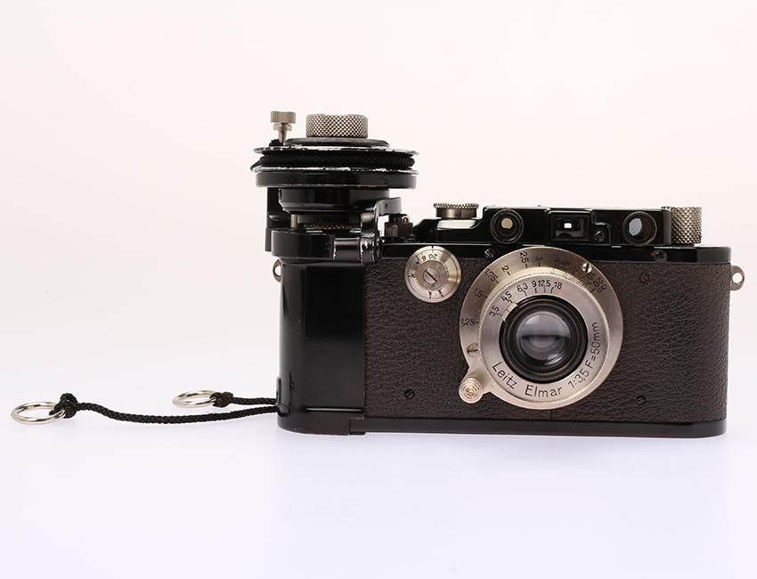 此拍品的亮點是非常罕有的手動快門調控系統(OOFRC),可直接安裝在機身上使用,此調控系統產於1935-1939年,主要使用兩條操控繩,分別用於操控快門按鈕,另一條則用於快速過片,大大提高了拍攝速度與方便性,這是徠卡早期產物中最具標誌性的配件。徠卡III Mod.f黑漆機身配有Elmar 3.5/50mm鏡頭(#142635)。相機操作正常,鏡頭玻璃完好,調焦暢順。配有鏡頭蓋及相機皮套。