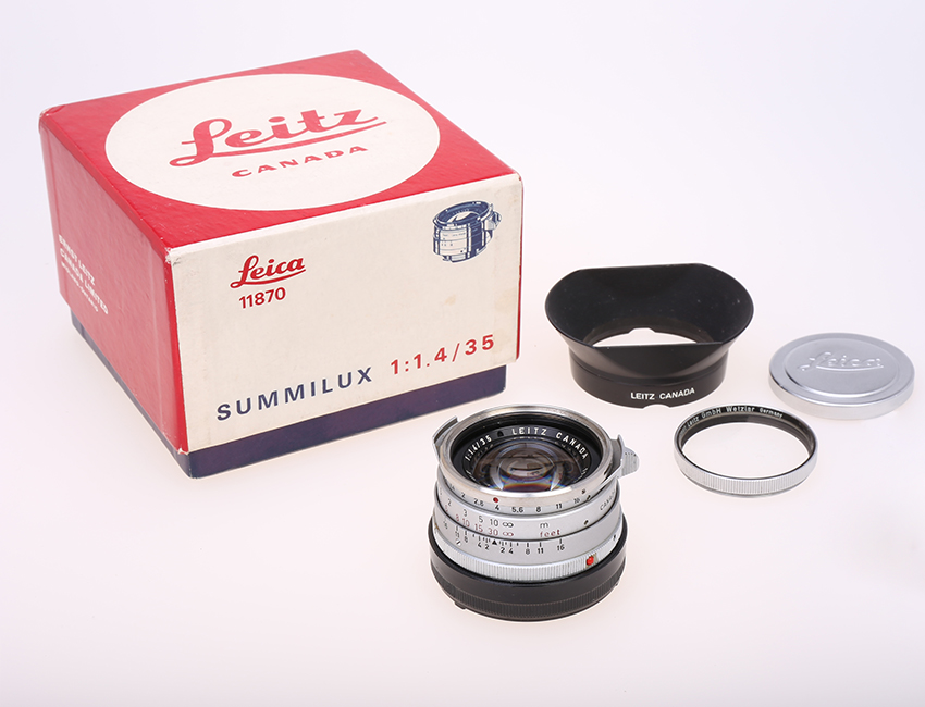 銀色Summilux-M 1.4/35mm鋼咀版,玻璃有霉。連OLLUX遮光罩、濾鏡、包裝盒及前後蓋。鏡頭有使用痕跡。