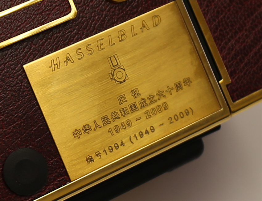哈蘇公司為慶祝中華人民共和國成立60年推出了一款限量版503CW紅皮金機。此機紀念號是1994號,所有金屬部件均飾以18K鍍金,其機身側面名牌上更刻有 “慶祝中華人民共和國成立60週年1949 – 2009” 字樣。此款鍍金限量版共生產61台,其中首台1949年編號己送予新華社作珍藏。套機配有經典的Distagon CFi 3.5/60mm (#8925091)鏡頭,菲林後背 (#30SE16932)。此套機全新未經使用,包裝證書全齊,非常珍貴。