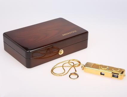 美樂時為德國著名微型攝影機牌子,如現時打火機般大小的微型相機於七十多年前面世,其封閉式的設計,微型的機身可握於掌中,可謂微型攝影機的先驅。此相機是MINOX微型相機面世50週年的紀念版,全球限量250套,以24K鍍金機身,配有專用皮套、收藏木盒及包裝證書,是收藏佳品。