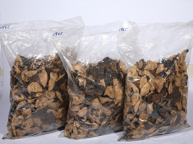 約50年的新會老陳皮,陳化時間較久,水分蒸發較為透徹,皮身乾脆,外表呈現棕黑色澤。年代久遠,加之曬制功夫較足,此老陳皮散發著一股乾燥、陳年的陳皮香味,隔著外包裝都能聞到。