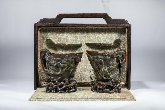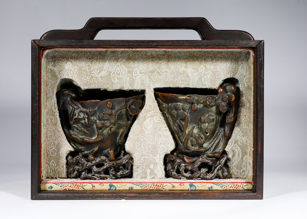 此杯以沉香整料製成,杯身以高浮雕刻梅花圖。樹幹曲折虯勁,枝葉錯落有致,直入杯內;梅花爭妍盛放,吐豔欲滴,充分表現梅花蒼勁剛毅、清新高雅及鐵骨迎春之神韻。