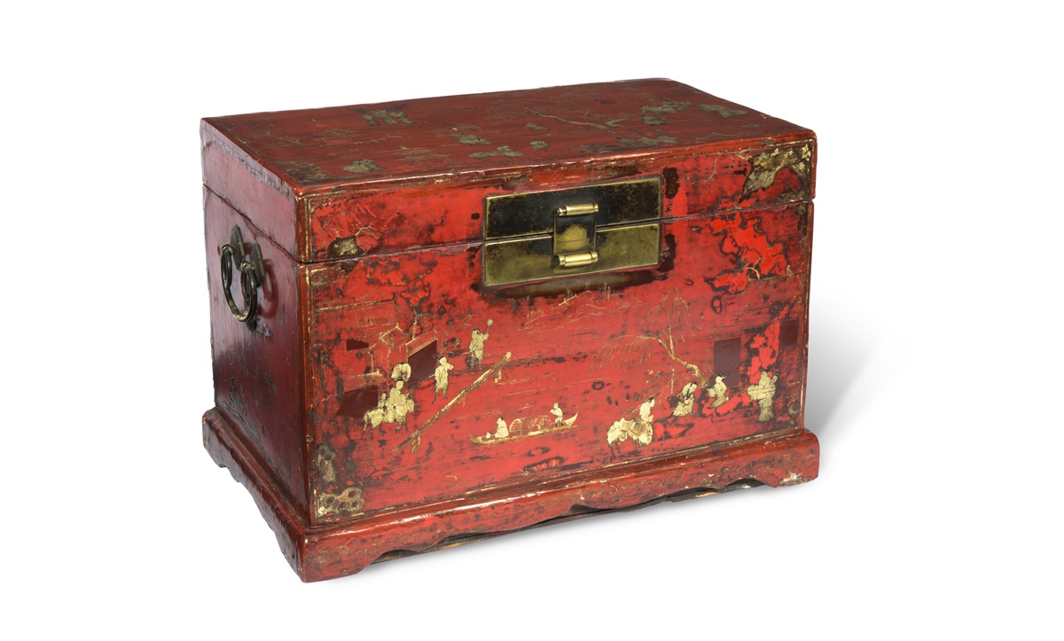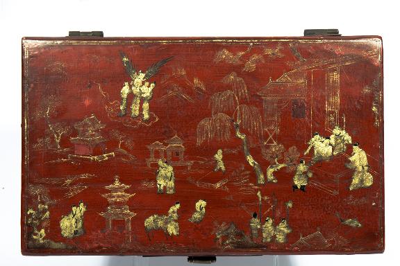 此箱通體紅漆,身上斑駁的紋絡顯示歲月流逝的古樸。器身正面及蓋面以塗金繪出人物百態;楊柳樹下切磋武藝,有的泛舟湖上愜意非常,蓋面更描繪仙翁乘雲降臨人間檢視眾生,神情和藹自若,栩栩如生。箱體兩則提環各一,繪飾花草圖樣,仿若微風徐徐吹動,景致傳神。