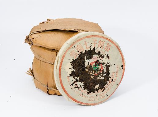 此藏品為80年代的7542普洱青餅為厚紙包裝,是普洱茶市場的指標產品,也是勐海茶廠最受歡迎的產品,至今有超過30年以上陳期,為普洱茶收藏市場的明星茶。它以肥壯茶菁為裡,幼嫩芽葉撒面,研配得當,面茶色澤烏潤顯芽毫,心茶肥壯。該茶品香氣純正持久,有荷花香,滋味濃厚回甘好,湯色黃亮,葉底勻齊;相當討喜。