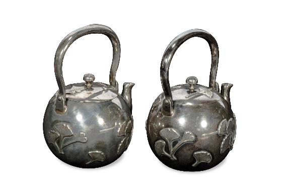 一對銀壺圓潤討喜,色澤瑩潤,包漿均潤自然。銀壺上浮雕銀杏紋,其葉脈清晰,細膩自然。銀杏樹葉形奇特,是著名的長壽樹種,生命力強,配於壺上寓意吉祥。整器雍容大方,寧靜雅致,使人身心悠然愜意。