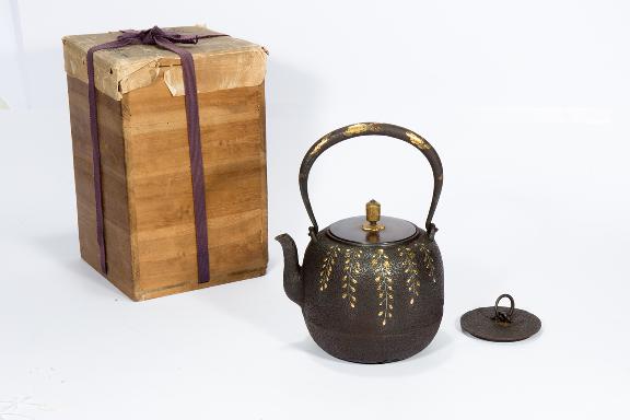 在樸拙的肌理上,釜師匠心獨運,以嵌金技法飾紫藤蘿紋;紫藤蘿自壺肩向壺腹擴散,有如點點星光撒落於塵世,呈現出充滿張力又富浪漫氣息的韻味。壺把金銀嵌花卉紋樣,清雅瑰麗,壺身見罕有橫款「龍文堂造」,配雙替蓋;一為荒地肌紋蓋相互呼應,另一蓋巧飾嵌金祥紋鈕摘及嵌金花形摘座,雍容大方,寧靜雅致;蓋內有款「龍文堂造」。整器彰顯安之介的精湛技藝,乃不可多得之作。