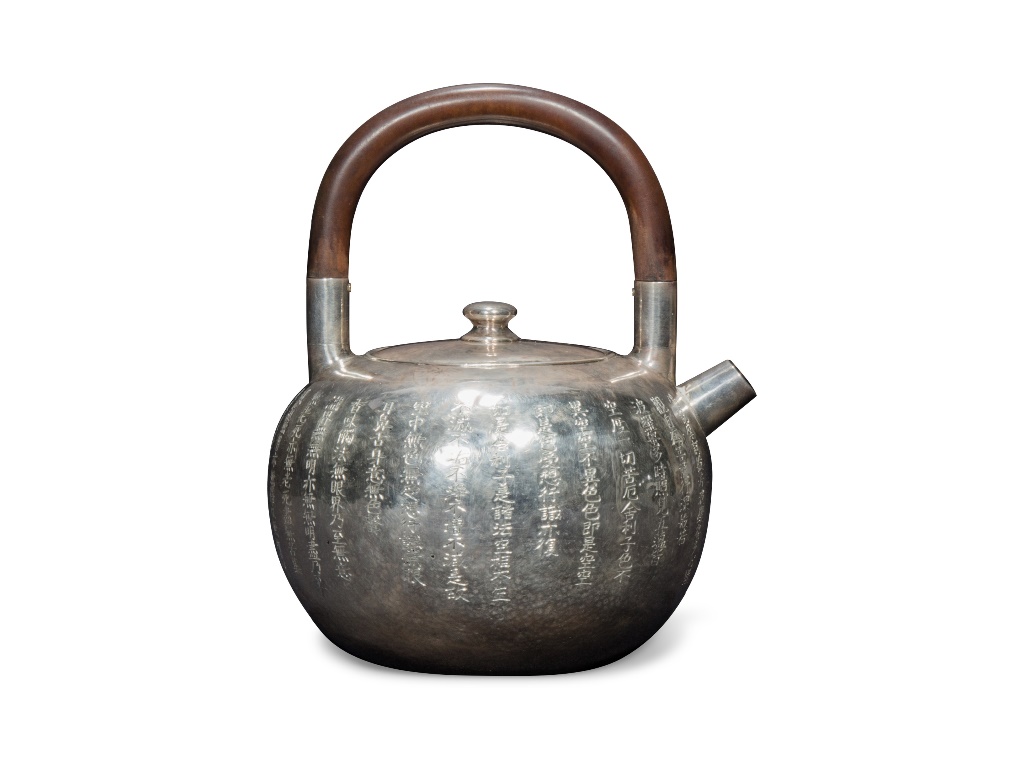 此壺器身圓潤為寶珠形,以純銀打造,壺身上半部虔刻般若心經,字體蒼勁工整;器身下半部滿佈槌目之痕,閃閃生輝,流光溢彩,展現出歲月洗滌後的淳厚韻味。配砲口壺流斷水利落,紫檀提梁起實際斷熱之效;於品茗時體驗般若思想與智慧,洗滌身心。