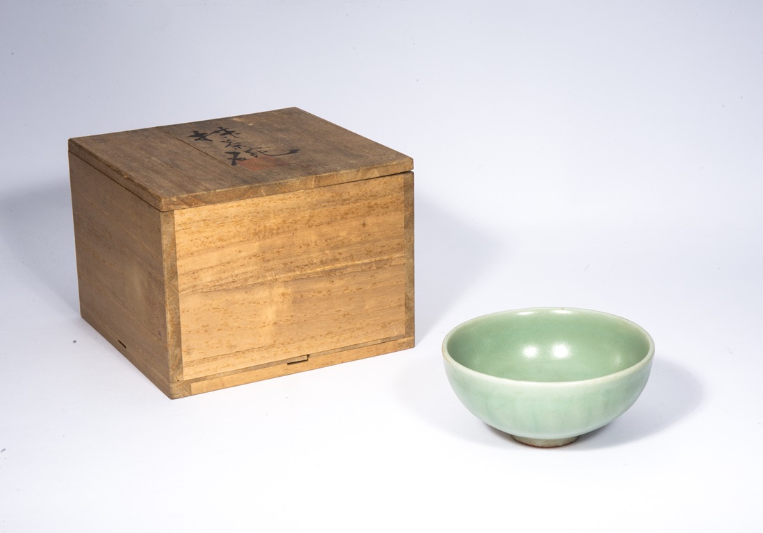 此品鼓腹下收,圈足。其形制小巧玲瓏,殊為龍泉窯製瓷經典式樣。整器通體施厚潤青釉,釉色均勻,飽滿帶亮澤。