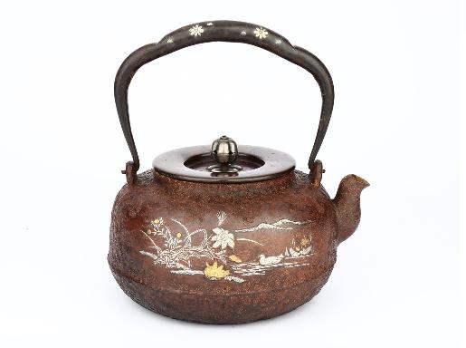 此壺壺身圓渾,荒地肌理壺身上雙面鑲嵌金銀花卉,仿若微風徐徐吹動,迎來陣陣暗香。壺刻波光粼粼,湖光山色,小鴨怡然游於其中,雕工層次分明,匠心巧思。三彎提梁上綴點點銀花,刻畫蝶戀花草,展現栩栩如生的美景。配上厚重的紫銅壺蓋,花苞形銀鈕及高肉花瓣摘座,倍添柔美。