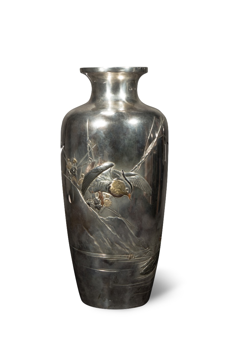碩大的銀製花瓶沿口外撇,聳肩,底足收窄。瓶上菊花枝葉脈絡清晰可見,栩栩如生;器身中央浮雕菊花鴛鴦圖,輔嵌金技術,優雅端莊。兩只鴛鴦分別在枝頭及湖泊上深情對望,羽翼刻畫細緻入微,眼神流露出依依不捨,好比佳偶一雙。