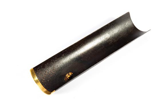 此藏品的茶量以鐵打出技法打出成器,底部嵌金,器身內側有一黃金高肉浮雕趣蟹,樸素中顯華美。配竹把金茶杓,竹子手把的部分素淨耐用,茶匙部分純金,用以取茶,盡顯茶趣。
