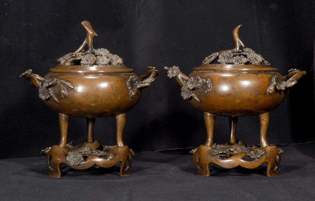 碩大圓渾的香爐手感沉甸,爐腹光素淡雅,只在爐耳接連處雕上菊花數朵輕輕點綴,淡然有味。爐座及爐蓋同樣滿飾菊紋,翹首盛放,姿態各異,相映成趣。菊花自古乃日本皇室專用的家徽紋飾,此對香爐雕工精細,展現和風淡雅的閑逸之情。
