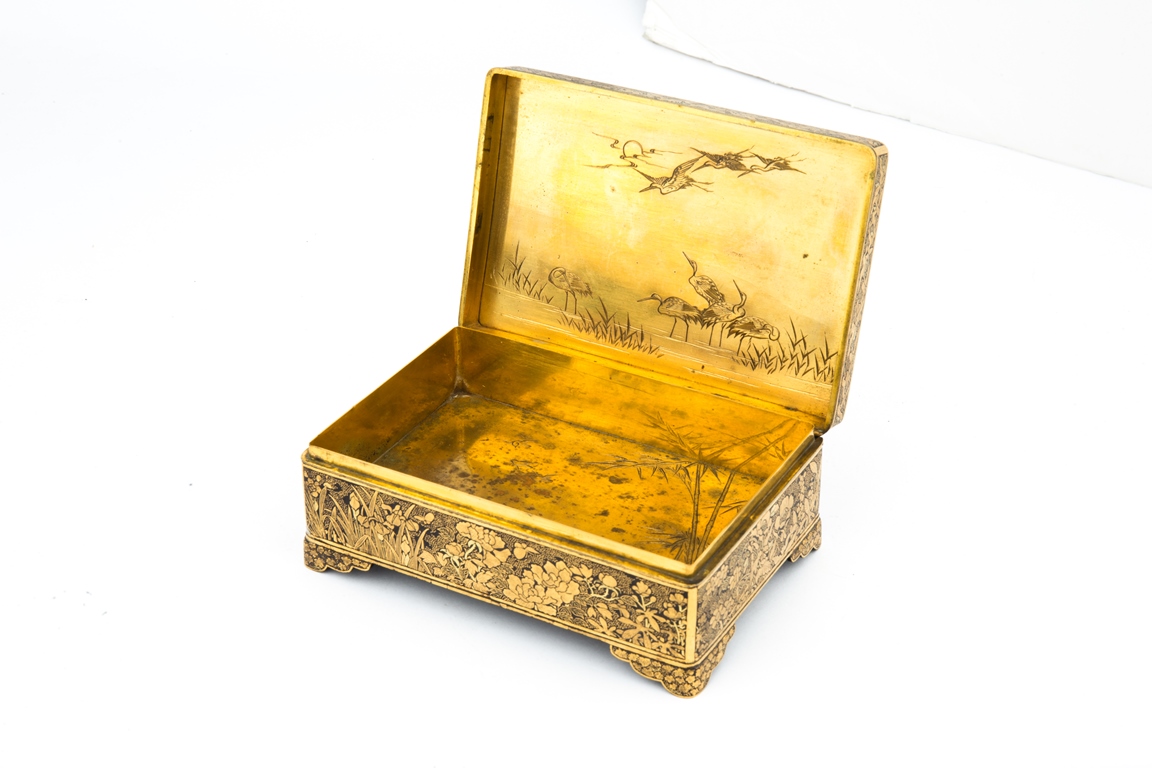 此藏品盒面為金堆銀砌的山水樓閣,流水穿越小橋,淙淙作響;背景的富士山氣度恢宏,白雪茫茫,靜謐空靈。香盒面緣飾葡萄浮雕圖紋,象徵多子多福。香盒四周滿工嵌金仙鶴與花葉圖,典雅瑰麗。盒內巧見靈鶴秀竹,盡見心思,更覺難得。