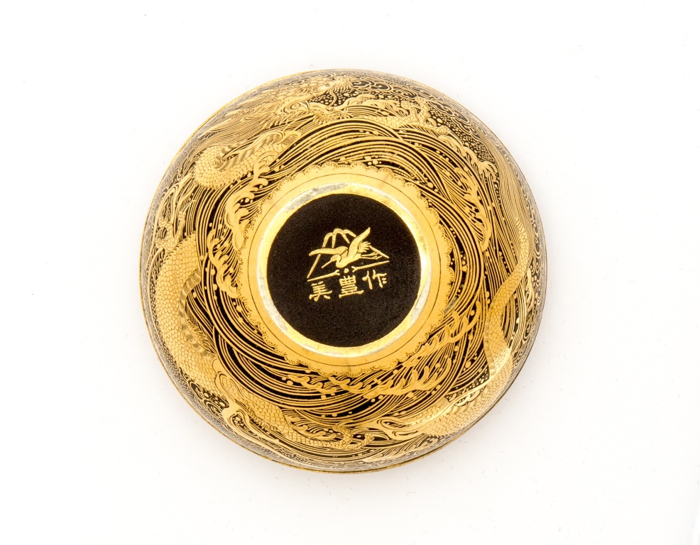此香盒通體以嵌金滿工技藝打造,盒面是金堆銀砌的樓閣山水圖,俯仰雍華繁美的樓閣亭台佇立松間,佈局極盡巧思。盒子邊沿有一道金龍在波濤裏長嘯,剛健威猛。器底有款「美豊作」。