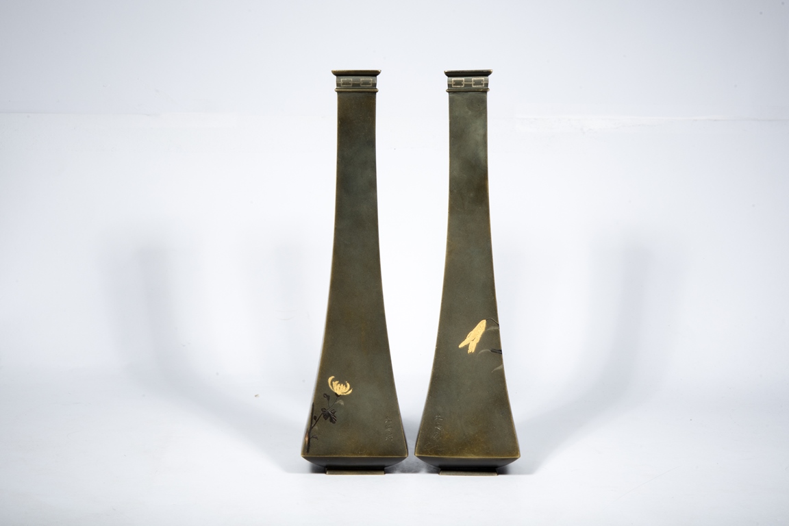 一對器形修長的塔形花瓶,淺刻花草紋樣;花卉清麗脫俗,青青竹子直接挺立天際,構圖簡潔流暢;輔嵌金菊花紋及靈鳥,更覺如詩如畫。