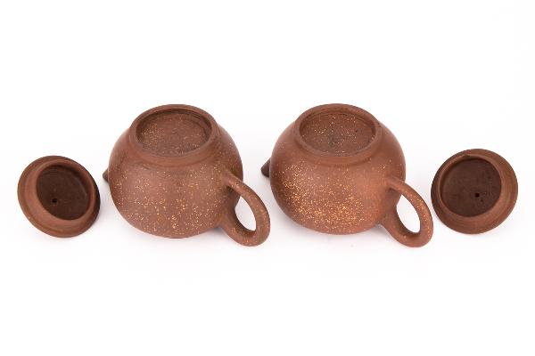 此對壺為紫泥鋪砂茶壺,造形圓潤,配乳鈕、環把。器身上點點砂色錯落有致,令壺體肌理豐富悅目,與紫棕胎色映配,更覺可人。共箱。