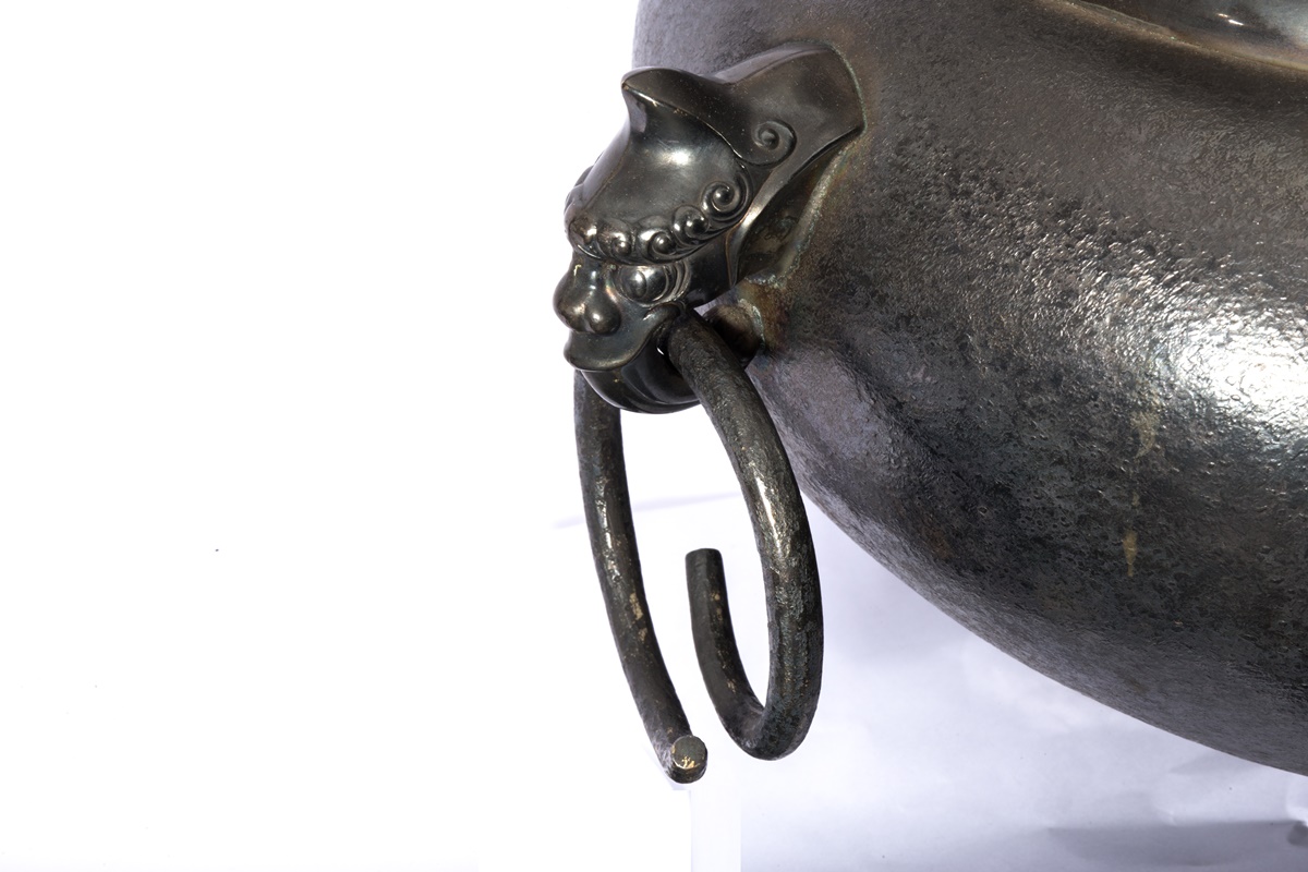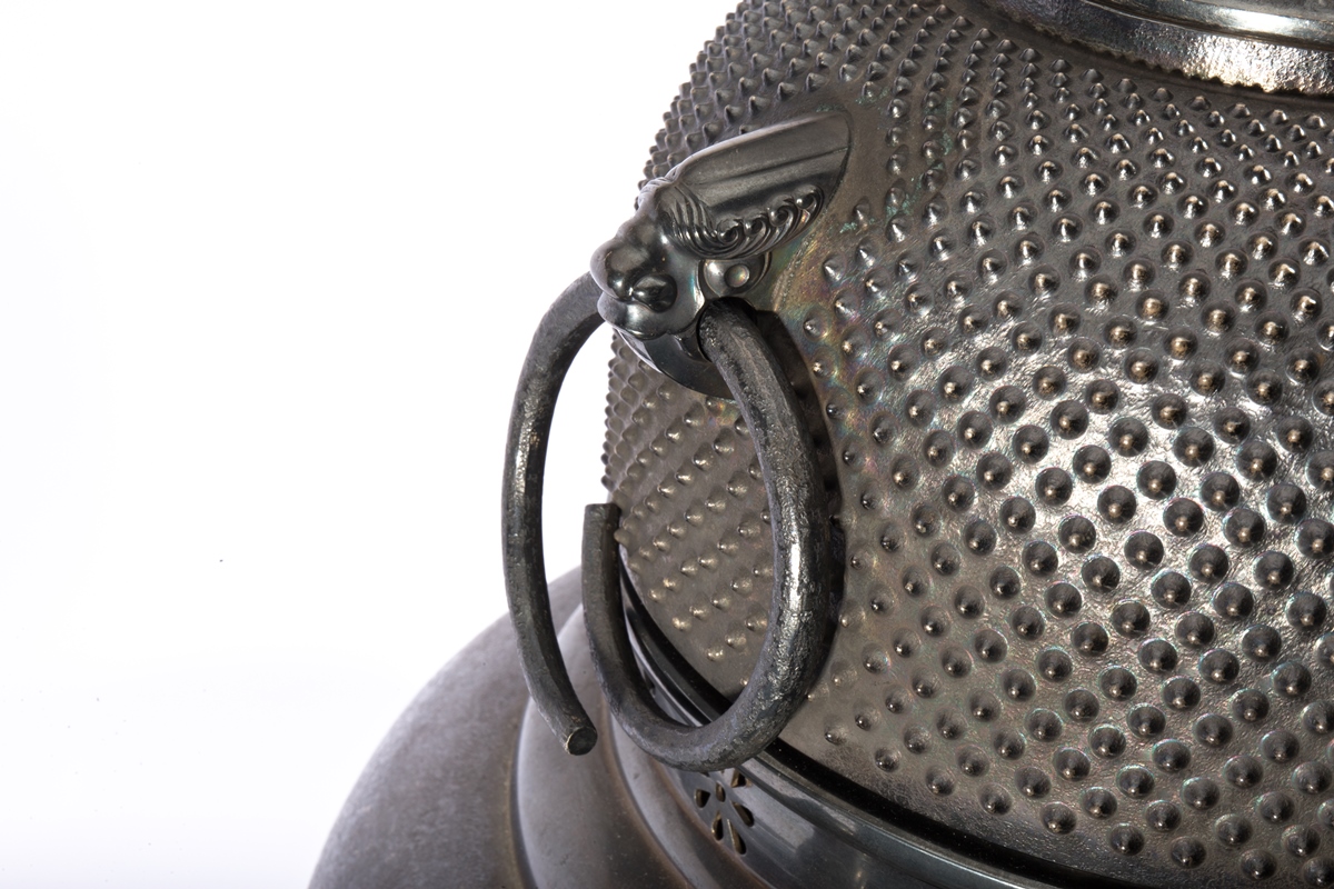 整器為純銀手工打造,厚重大方,形器豐腴。釜身滿佈手工霰粒,均勻漸變,霰粒由釜身向肩蓋逐漸縮小;配鏤空寶珠形鈕摘,工藝細膩難得,匠心獨運。火缽更見渾圓敦厚,下承三足短乳,器身開窗;與銀釜同飾獸首口銜環把雙耳,神氣逼人,惟肖惟妙。整器古意盎然中帶拙趣,實在不可多得。