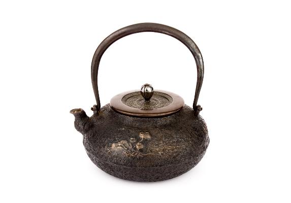 龍文堂 安之介造 銀嵌花草靈芝紋鐵壺