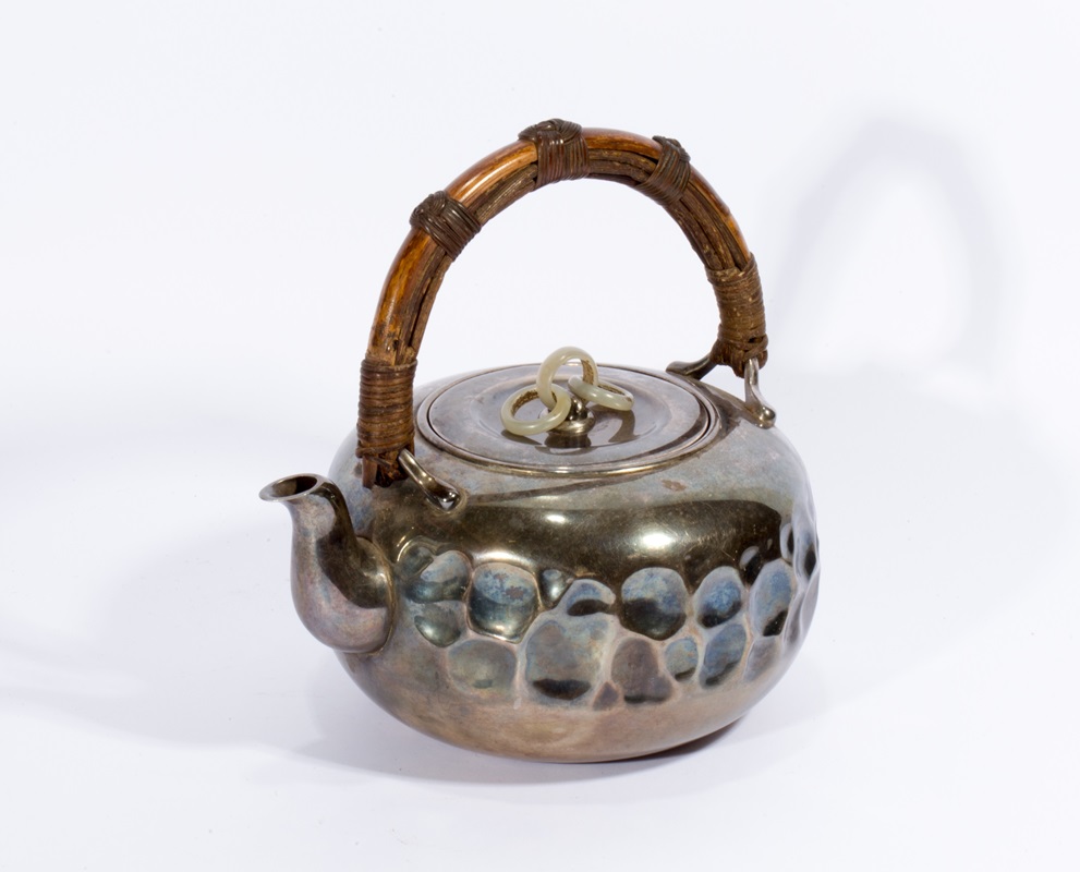 此藏品為大槌目紋銀壺,壺身以大小槌目打造,在光素瑩潤的皮殼映襯下,更顯端莊大氣。壺蓋的環形玉石鈕摘為整器起點睛之效,其形翠綠通透,包漿瑩潤,套目繽紛;與粗獷隨性的竹製提梁形成強烈對比,令人愛不釋手。