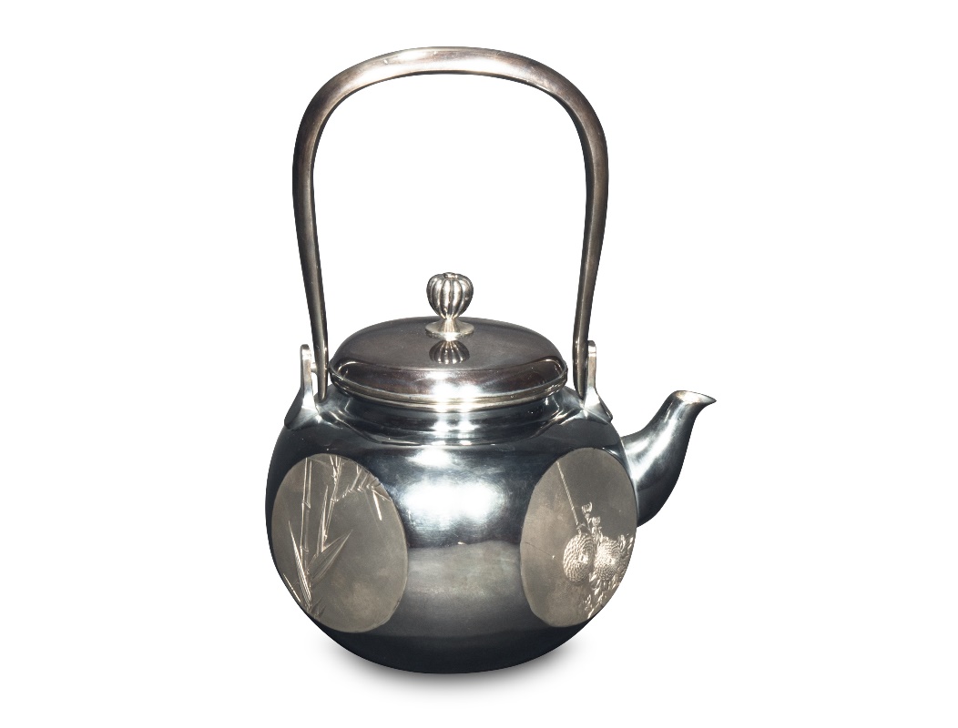 皮殼晶瑩,流光溢彩的銀壺三面開窗,以四君子為題,分別刻畫梅花的高潔雅麗